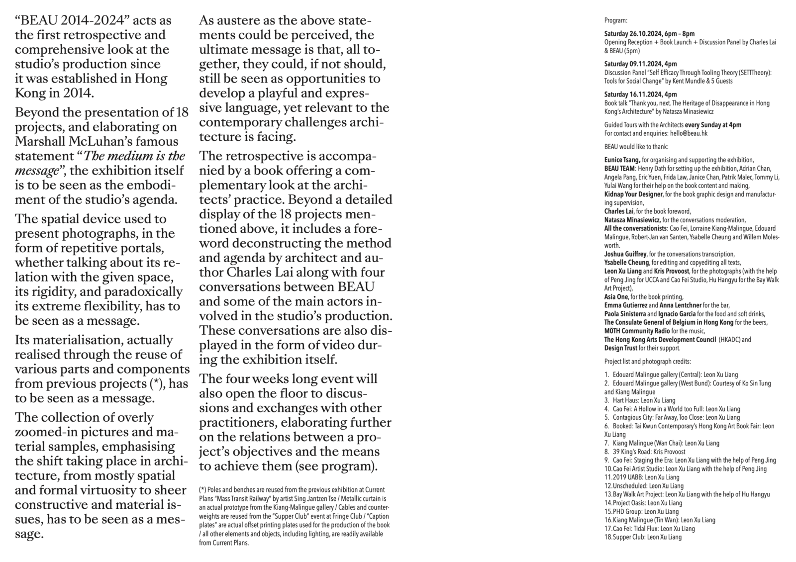 Eunice Tsang (exhibition organiser), Kidnap Your Designer (book Graphic Design), Charles Lai (book foreword), Natasza Minasiewicz (conversation moderation), Cao Fei, Lorraine Kiang, Edouard Malingue, Rober-Jan van Santen, Ysabelle Cheung, Willem Molesworth (conversationists), Leon Xu Liang, Kris Provoost (photographers), The Hong Kong Arts Development Council (HKADC), Design Trust (sponsors)